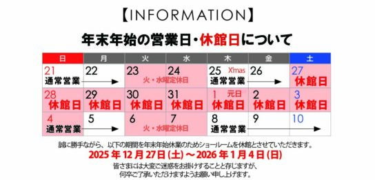 誠に勝手ながら、以下の期間を「定休日および臨時休館日」の為、ショールームを休館と